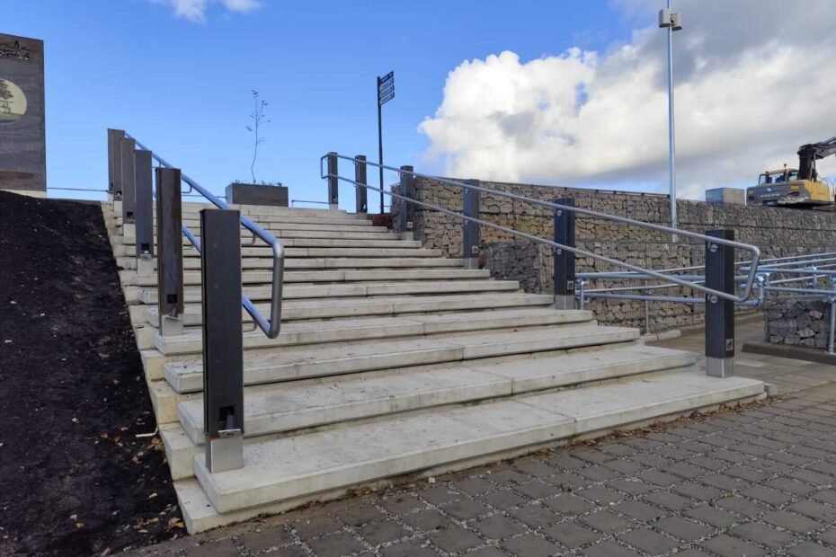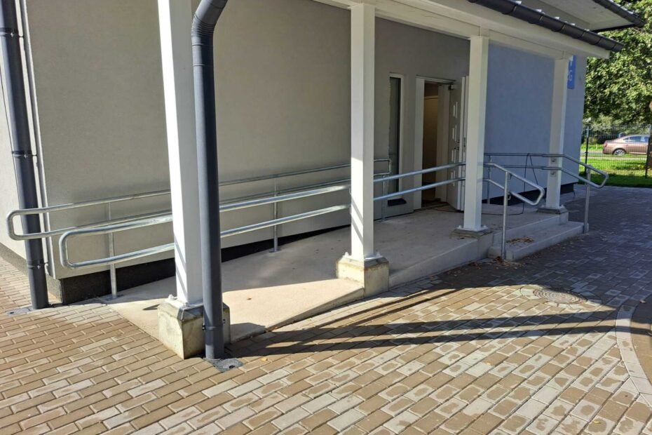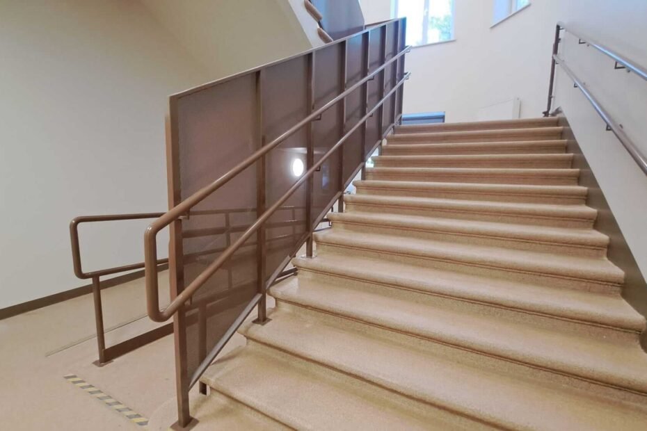 Kāpņu tērauda margas skolā ar perforēta loksni aizpildījumu, pandusa margas – Vāne